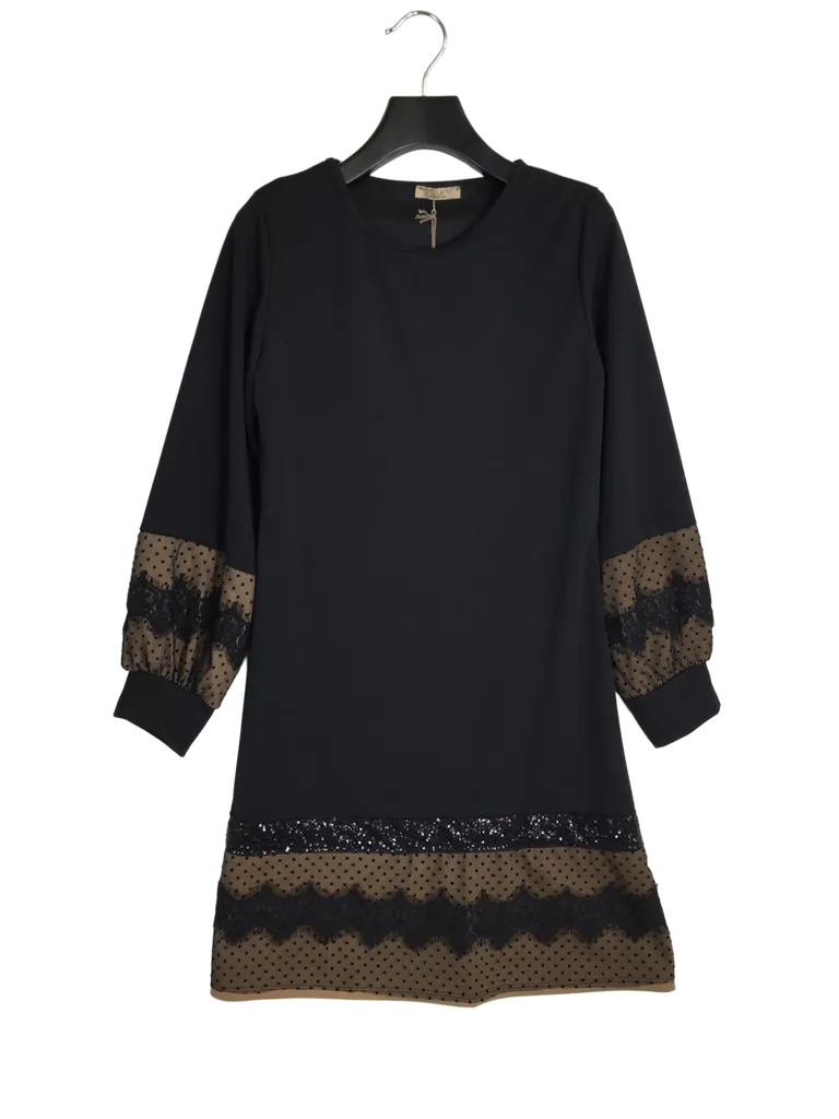 Description Vestito Dritto Mini in Jersey Manica lunga, Scollo tondo, Con pizzo, Con paillettes